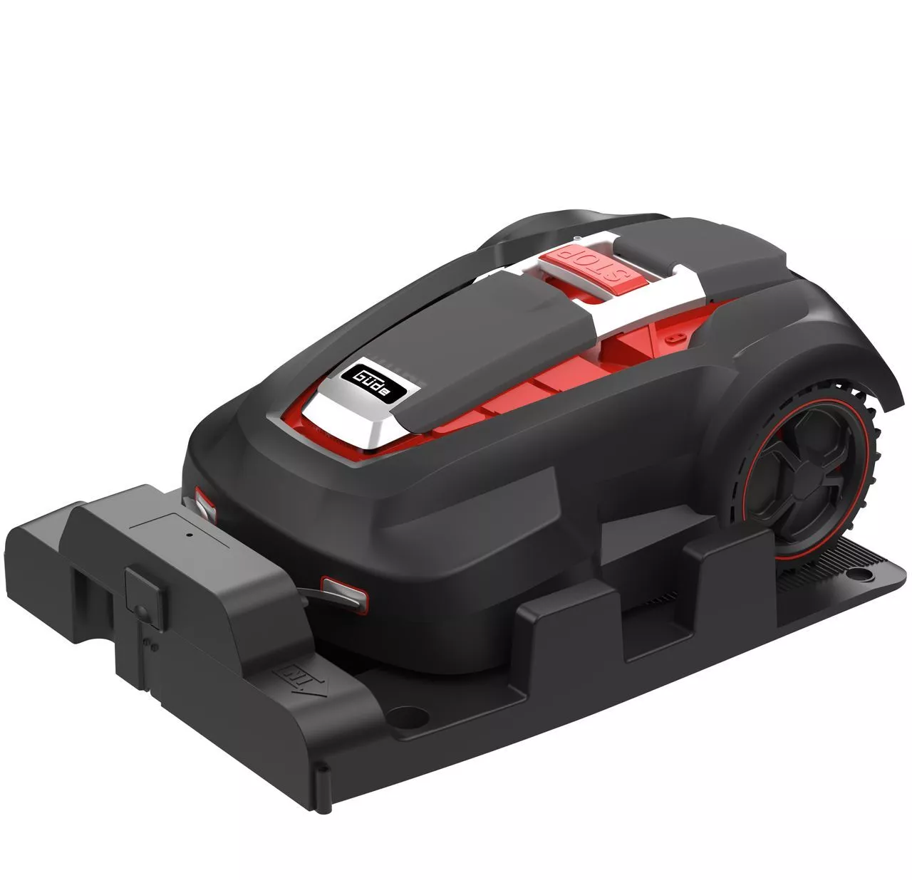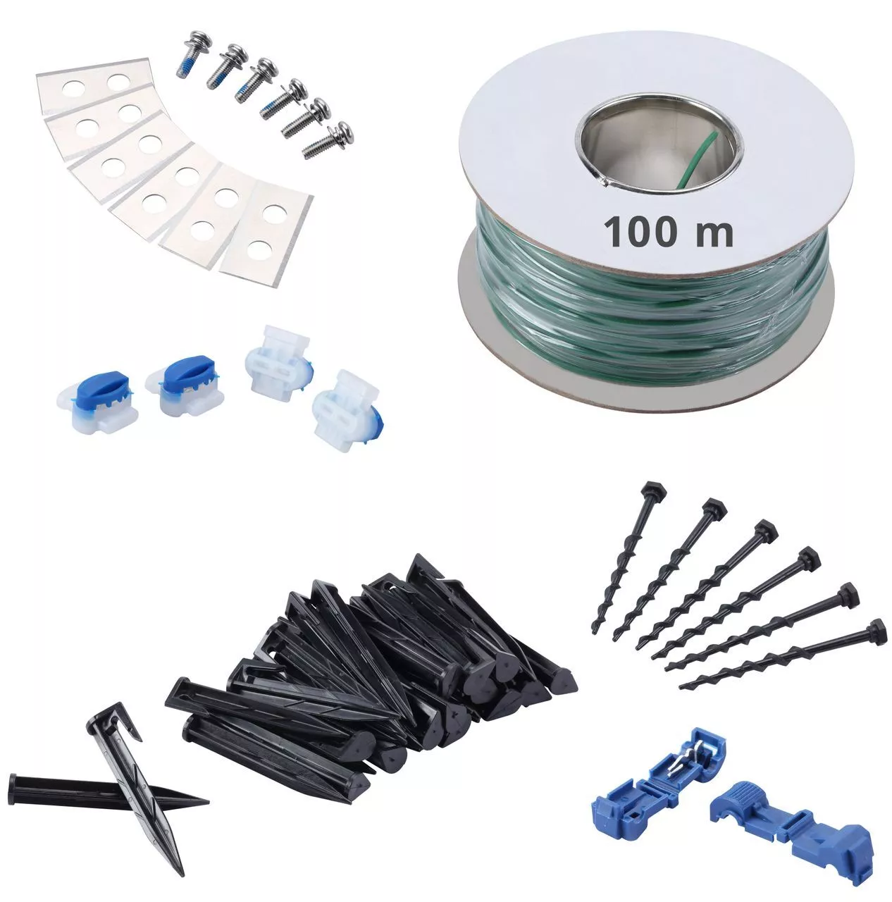 Robot tondeuse GRR 240.1, station de charge avec câble d’alimentation, 6 vis de terre pour la station de charge, 100 m de câble de délimitation, 150 piquets de terre avec crochets pour le câble de délimitation, 4 connecteurs de câble, 6 lames de rechange et 2 adaptateurs.